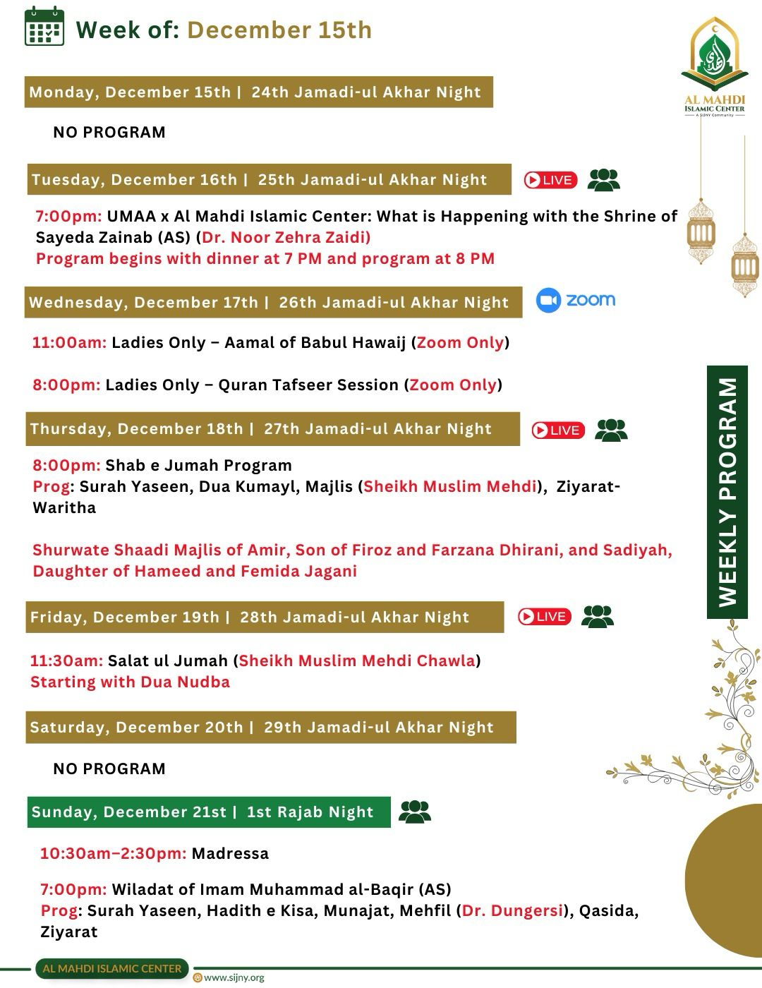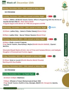 Update : Thursday, October 2nd, 2025 – Program begins at 8:00pm Inna lillahi wa inna ilayhi raji’un. With deep sorrow, we extend our heartfelt condolences to the entire ummah on the passing of the respected wife of His Eminence Grand Ayatullah Syed Ali Sistani (May Allah prolong his life). Quran Khani and Ithaale Sawaab Majlis …