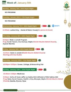 7:10pm: Shab e Jumah Program Prog: Salat, Nyaz, Surah Yaseen, Dua Kumayl, Majlis (Dr. Dungersi), Ziyarat- Waritha