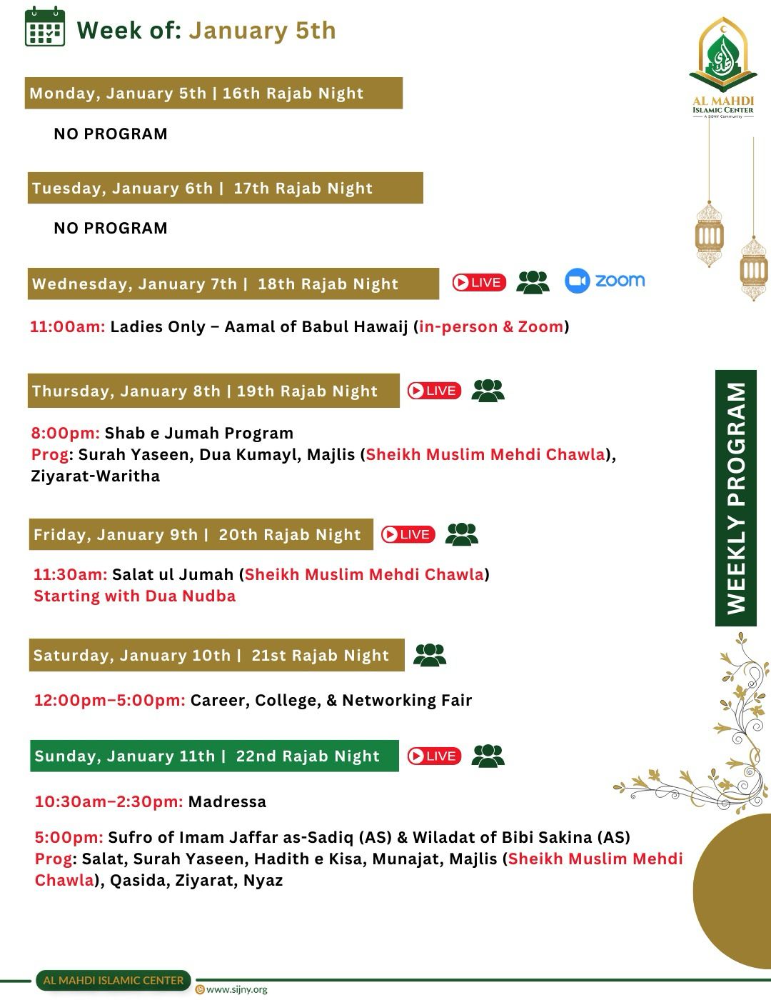 Al-Mahdi Islamic Center THE MONTH OF RAJAB 1447 AH ๐ Moon Sighting Update โ Rajab 1447 A.H. Salaam Alaikum, Al-Mahdi Islamic Center would like to inform the community that verified sightings of the crescent moon were reported on the evening of Sunday, December 21st, 2025, across North America. Accordingly, Monday, December 22nd, 2025, will mark …
