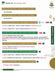 Update : Thursday, October 2nd, 2025 – Program begins at 8:00pm Inna lillahi wa inna ilayhi raji’un. With deep sorrow, we extend our heartfelt condolences to the entire ummah on the passing of the respected wife of His Eminence Grand Ayatullah Syed Ali Sistani (May Allah prolong his life). Quran Khani and Ithaale Sawaab Majlis …